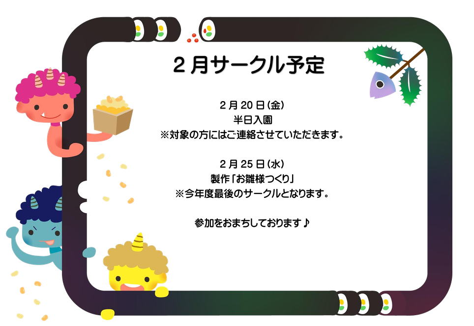 ![]() 令和7年度 親子サークルの日程がきまりました。 ご登録を受け付けていますので どうぞお立ち寄りください ![]() ![]() ![]() ![]() ![]() 親子サークルの申込用紙は 当園にございますので お立ち寄りください ![]() |