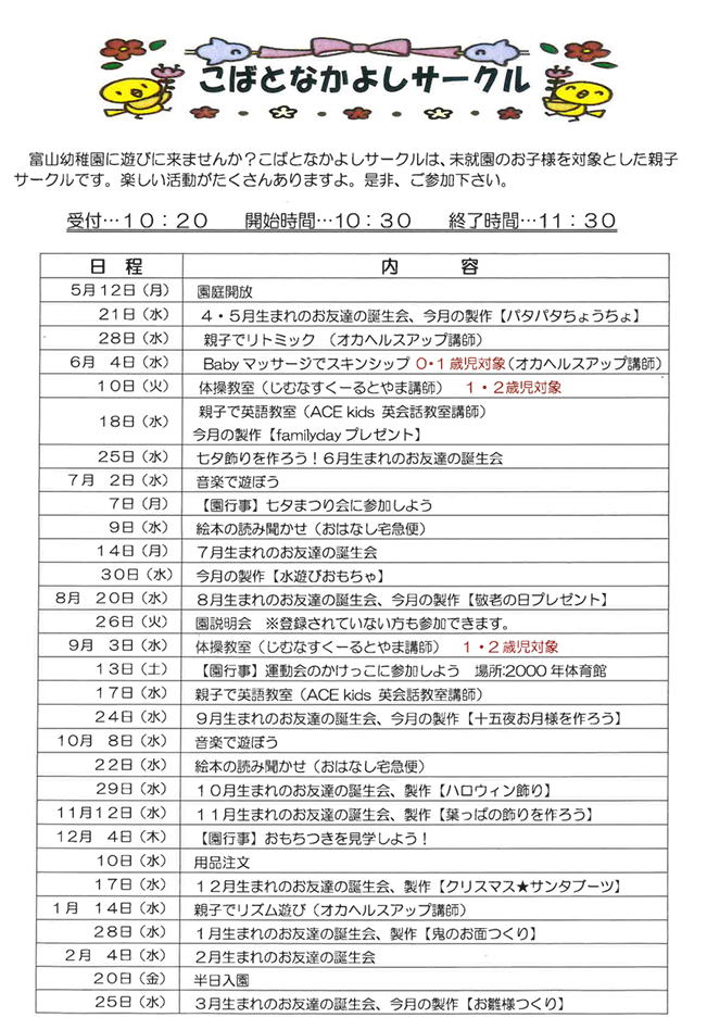 ![]() 令和7年度 親子サークルの日程がきまりました。 ご登録を受け付けていますので どうぞお立ち寄りください ![]() ![]() ![]() ![]() ![]() 親子サークルの申込用紙は 当園にございますので お立ち寄りください ![]() |