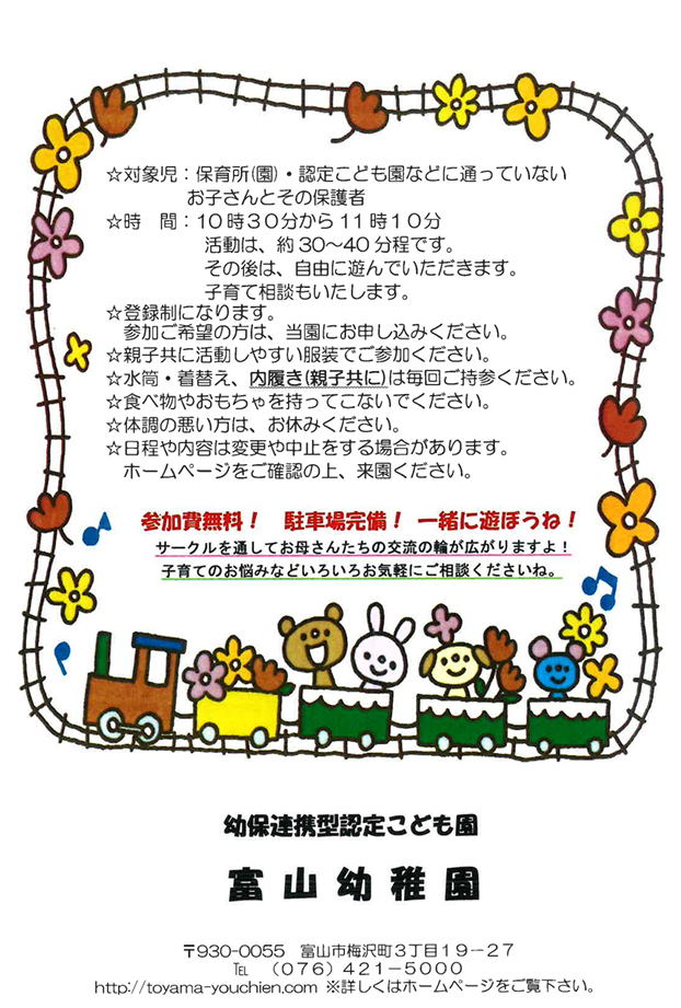 | 親子サークル参加時のお願い 前日と当日の朝、体調がすぐれない場合は、お休みをしてください 晴れた日は園庭を開放しますが、雨天の場合は室内での遊びとなりますので、 終了時間が早まる場合があります 水筒、内履き(親子共)、手拭き用タオルをご持参ください 駐車場は、幼稚園駐車場をご利用ください |
